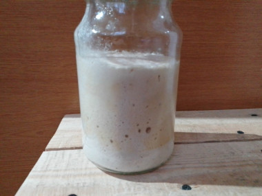 Взяла шишки хмеля, собранные осенью с забора. Прокипятила их 10 мин, процедила, добавила сахара и муки до нужного состояния и переложила массу в чистую стеклянную банку. Закрыла ее крышкой и поставила на батарею (она слегка теплая). Муку взята 1-го сорта. Делала это вечером и оставила так на ночь. Утром сверху увидела отслоившуюся воду, слила ее, массу перемешала и вернула назад. К вечеру закваска увеличилась в два раза и я поставила ее в холодильник на ночь.