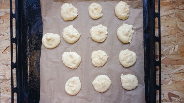 Яйцо взяла категории С1. Муки ушло столько же, сколько указано в рецепте. Тесто получилось густое, гладкое. Выпекала печенье на силиконизированном пергаменте. Тесто выкладывала чайной ложкой. У меня получилось 13 печенек.