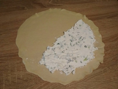На одну половинку теста выложите десертную ложку начинки, разровняйте ее тонким слоем, отступив сантиметр с краю.