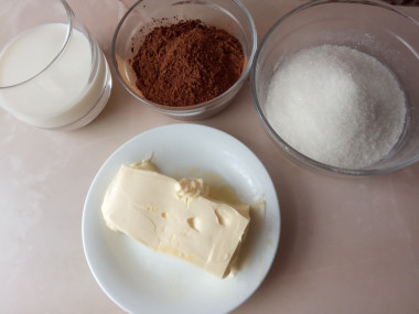 Как сварить домашнюю глазурь для покрытия торта из какао? Подготовьте продукты. Какао-порошок берите натуральный и качественный, без сахара и других добавок. Сливочное масло выбирайте натуральное, качественное, 82,5% жирности. Вместо молока можно использовать сливки, глазурь получится еще более сливочная. Для аромата можно добавить щепотку ванилина, а для усиления вкуса - соль на кончике ножа. Масло выньте из холодильника заранее, чтобы оно стало мягким.