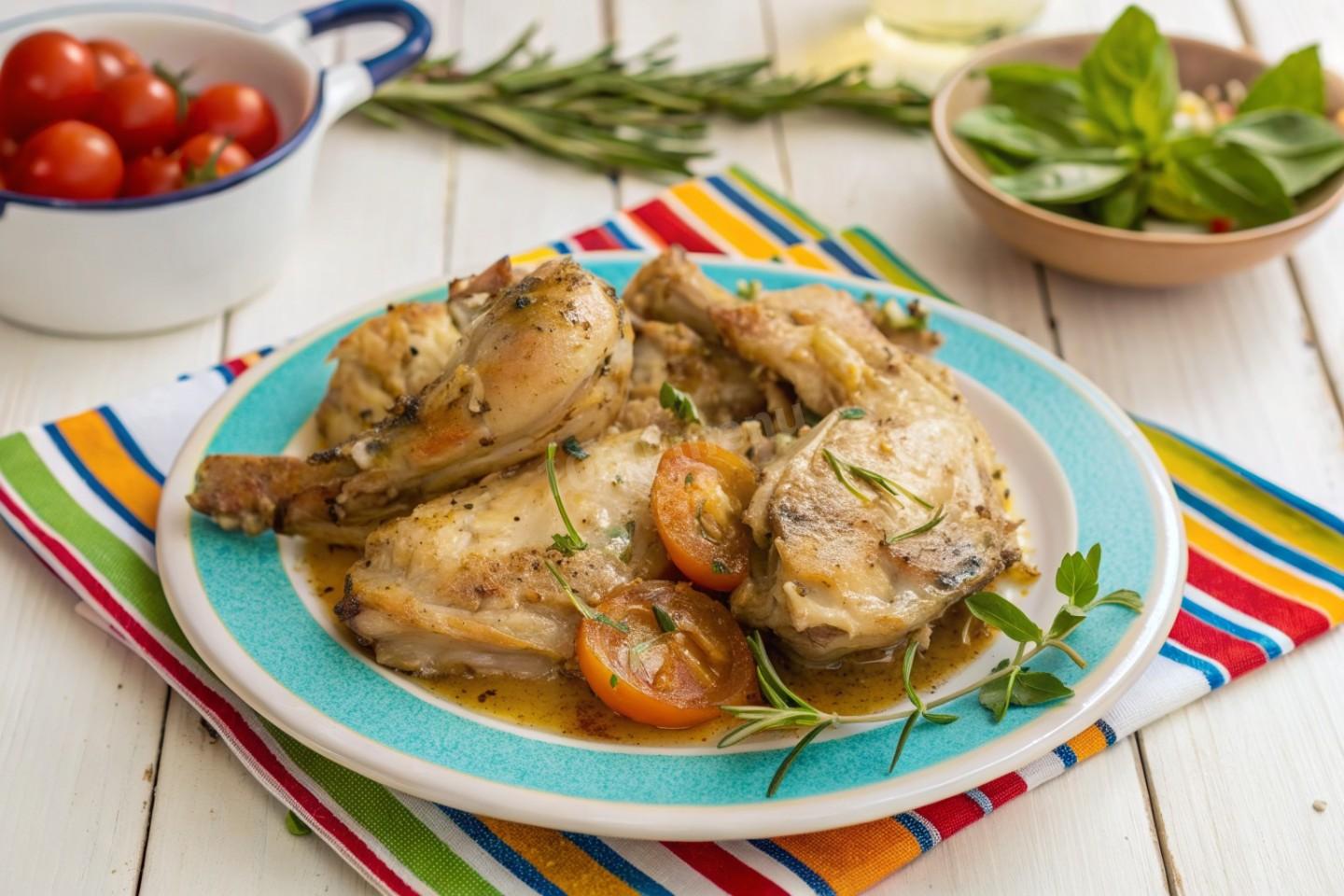 Соевого соуса у меня не было, вместо него добавила столовую ложку уксуса 9%. Из сухих специй использовала смесь итальянских трав. Мариновался кролик около трех часов. Запекала кролика 1,5 часа.