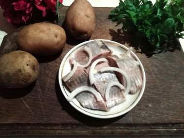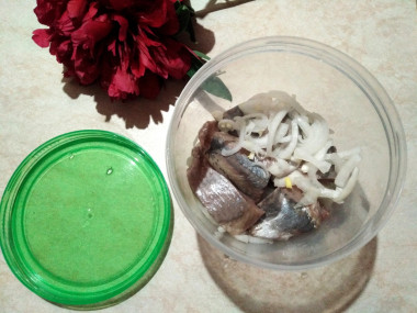 Уложите на дно стеклянной банки подушку из лука. Далее выложите половину селедки. Снова слой лука. И опять селедка.