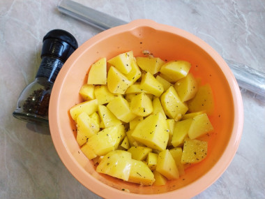 Картофель сложите в глубокую миску, влейте в него ароматное масло со специями.