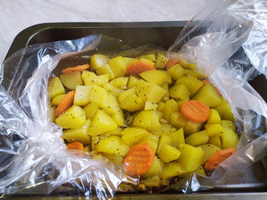 Переложите картофель вместе с маринадом в рукав для запекания, который, в свою очередь, положите на противень. Рукав затяните с двух сторон клипсами или, если их нет, завяжите концы, чтобы не вытекал сок. Сделайте несколько проколов зубочисткой для выхода пара.
