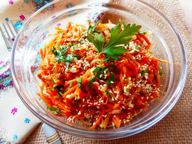 Морковь очистите,ополосните под проточной водой и натрите на терке для корейских салатов. Если такого приспособления нет, то можно морковь нарезать ножом тонкой соломкой, на вкус это не повлияет.