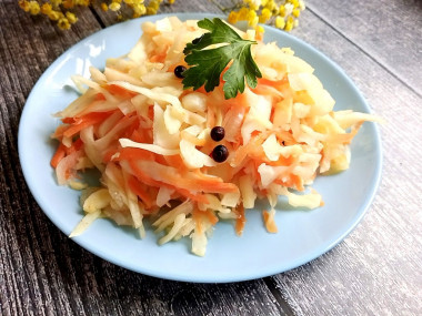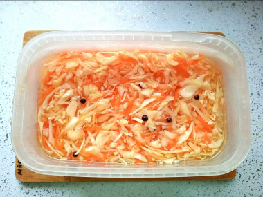 Выбрала рецепт капусты в банки быстрого приготовления, т. к. это один из самых простых способов засолки капусты. Правда в банках я давно уже не солю, их не удобно ставить в холодильник. Капусту квашу и мариную в контейнерах и ведёрках из-под солений. Для этого салата я нарезала капусту, слегка её помяла и смешала с тертой морковью. Затем переложила в контейнер и залила остывшим рассолом. Капусту не утрамбовывала, т. к. все равно она находится в готовом рассоле. Кстати, это удобно. Сейчас капуста жесткая и сухая, а готовый рассол помогает ей просолиться и закваситься. Контейнер стоял у меня на столе три дня под марлей, содержимое периодически перемешивала. Капуста особо не "кипела", но просолилась хорошо, даже кислинка появилась. Дальше ещё два дня подержала капусту в холодильнике для закрепления эффекта). Подавала соленую капусту на ужин, полив ароматным маслом. Получилось вкусно, капуста хрустящая. Соли и сахара как раз в норме, ещё и приятная кислинка есть.