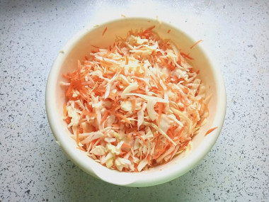 Капусту и морковь кладем в глубокую емкость, перемешиваем их, можно помять руками, чтобы овощи пустили сок.