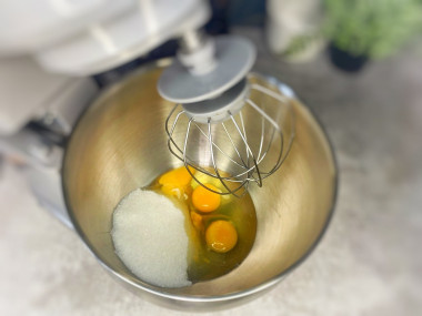 Приготовление торта начнем с выпечки бисквита. Для этого соедините в чаше для взбивания яйца с сахаром. Взбейте их на самой большой мощности миксера в пышную пену. Взбитые яйца с сахаром должны получиться очень пышными, воздушными и густыми.