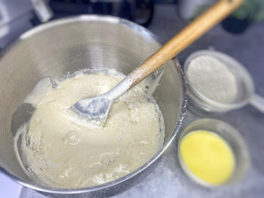 Во взбитые белки попеременно добавляйте горячее молоко с маслом и муку с содой и ванилином. Все аккуратно мешайте венчиком вручную,чтобы масса оставалась пышной и воздушной. Вводите все в 3-4 приема. Тесто должно остаться хорошо насыщенным кислородом.