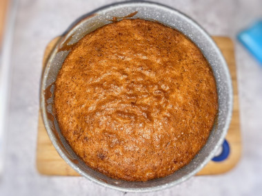 Готовое тесто вылейте в форму для выпечки (18см). Поставьте форму в духовку, разогретую до 180 градусов на 40-50 минут. Готовый бисквит извлеките из формы и остудите. Перед сборкой торта разрежьте бисквит на 3 коржа.