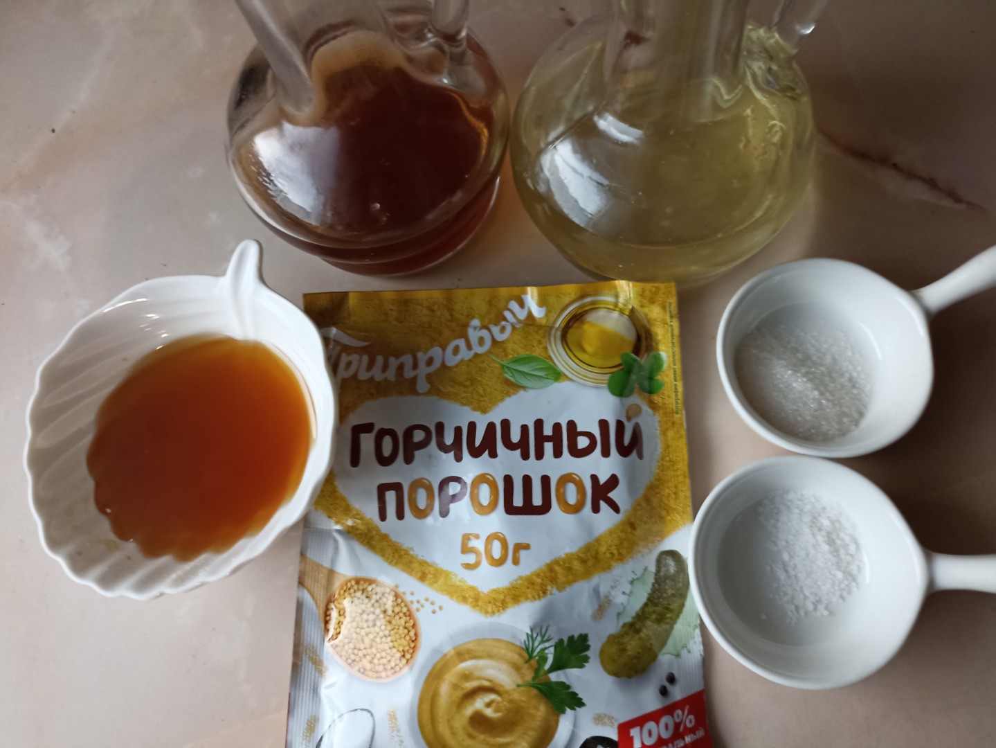 Как сделать сладкую горчицу? Подготовьте все необходимые ингредиенты. Растительное масло можете взять любое, на ваш вкус, у меня подсолнечное без запаха. Уксус может быть любой, я взяла бальзамический, так как люблю его аромат, возьмите тот, который вам нравится или просто имеющийся. Можно добавить щепотку соли для баланса вкуса, что я и сделала. Это по желаниюШаг 2:
