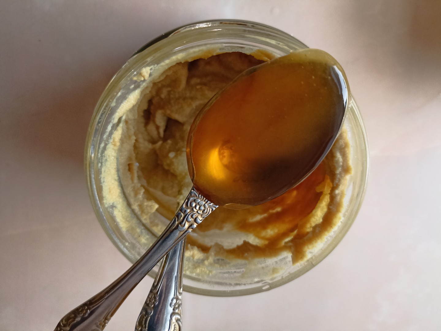 Добавьте сахар и мед, продолжайте перемешивать до однородной консистенции, добавьте щепотку соли и растительное масло. Снова перемешайте. Если у вас засахаренный мед, то предварительно растопите его на водяной бане или в микроволновке.Шаг 5: