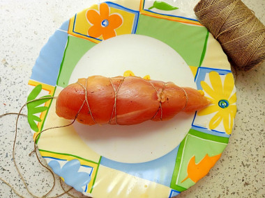 Далее нужно проколоть мясо большой иголкой с продетой в нее толстой капроновой или иной прочной нитью, на которой филе будет повешено для вяления. Также подойдут небольшие крючки.