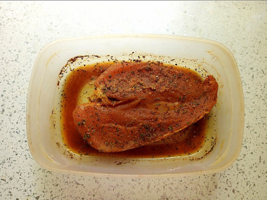 Промойте филе под проточной водой и промокните его от лишней жидкости. Мясо должно быть абсолютно сухим. Это можно сделать кухонным или бумажным полотенцем.