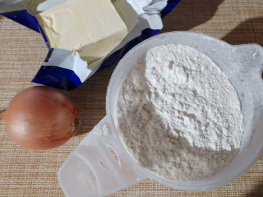 Тем временем приготовим репчатый лук. Можно использовать одну большую луковицу или две маленькие, а по желанию и увеличить количество начинки. Репчатый лук чистим от шелухи. Нарезаем лук мелко ножом, чтобы крупные кусочки лука не порвали тесто.