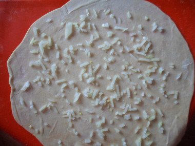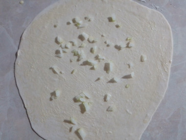 Потом раскатала, смазала растопленным в микроволновке сливочным маслом, сверху выложила немного мелко нарезанного лука.