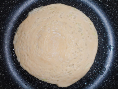 Затем «улитки» с луком раскатываем в тонкие лепешки. Сковороду смазываем сливочным маслом, разогреваем его.