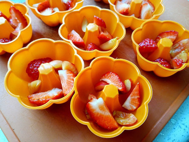 Для меня тоже сочетание творога с желатином и фруктами самое любимое. Очень мне нравится готовить такие десерты, тем более продукты все полезные, а в тандеме ещё и вкус потрясающий. Собираясь готовить десерт обнаружила, что творога у меня 300 г. Решила не уменьшать порции, а добавить 100 г. сметаны. Мне кажется, это хорошая замена) Двух ложек сгущенки на мой взгляд достаточно для сладости. Получилось сладко, но не приторно. В качестве наполнителя у меня была клубника, А так же решила сорвать несколько черешен. Но они ещё только начинают спеть, все же взяла несколько штучек, уже так хочется черешни покушать) А вот для персиков не сезон, поэтому побольше клубники добавила. Перемешать творожную массу с фруктовыми кусочками на удалось, слишком увлеклась начинкой. А масса тем временем начала желироваться. Поэтому решила разложить ягоды в силиконовые формочки и залить сверху желейной массой. Получилось очень здорово! Десерты застыли быстро, кстати получилось 10 формочек для кексов. Это очень приятное желе, вкусное, нежное, со свежими ягодными нотками. Оно не резиновое, консистенция чуть плотного суфле. Отличный десерт, спасибо!
