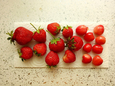 Персик, черешню и клубнику вымойте обсушите. Персик нарежьте небольшими кусочками. Черешню разрежьте пополам и выньте из неё косточки. Можно каждую половинку разрезать еще на две части. Клубнику нарежьте четвертинками.