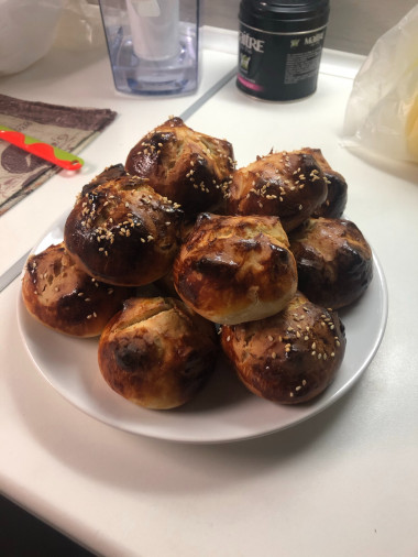 Булочки смазал желтком и посыпал кунжутом. Желток в процессе выпечки сильно потемнел (а не пригорел), поэтому в следующий раз буду смазывать целым яйцом. Хотя и без смазки должно быть замечательно.