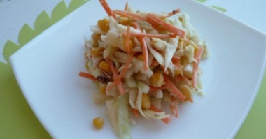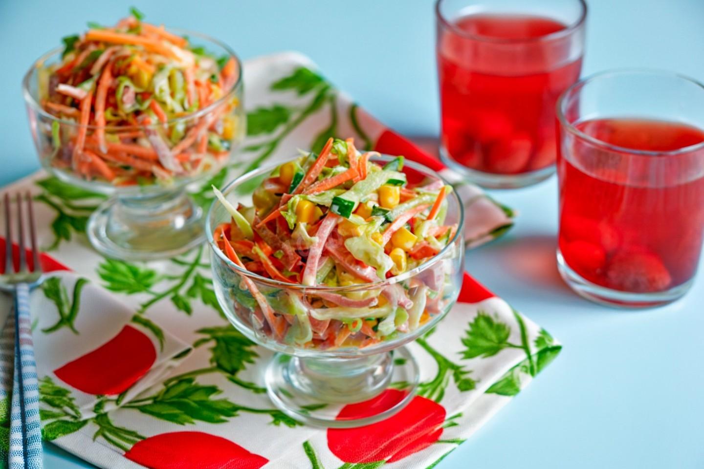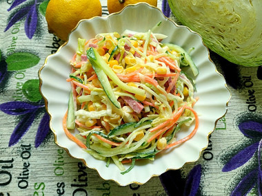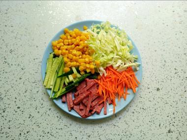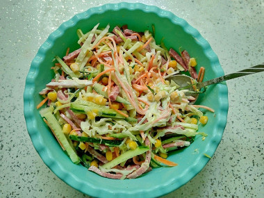 С консервированной кукурузы слейте рассол, для этого можно откинуть ее на сито. Смешайте в салатнике колбасу, огурец, морковь, капусту и кукурузу. Посолите и поперчите салат по своему вкусу. Учитывайте, что в майонезе уже есть соль.
