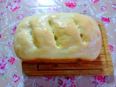 После сигнала о готовности, аккуратно достать батон из хлебопечки и смазать небольшим количеством оливкового масла. Остудить и можно приступать к дегустации.