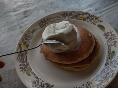 Вообще, к панкейкам подходят любые добавки - мед, варенье, сгущенка. Отлично сочетаются они со сметаной, сливками, растопленным шоколадом. Посыпьте горку панкейков орехами или ягодами, будет не только вкусно, но и очень красиво. Я люблю подать к панкейкам сметанно-ягодный соус - для этого просто смешиваю сметану и варенье, можно вместо сметаны взять натуральный йогурт.