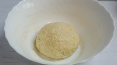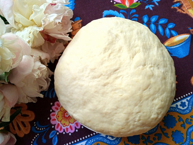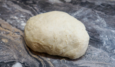 Стол мукой я не присыпала, потому что тесто не липло к рукам. Если все же у вас оно будет немного липнуть, то присыпьте рабочую поверхность мукой и не забудьте в процессе замеса вымыть и насухо вытереть руки, иначе на них может налипать тесто. Вымешивайте тесто 10 минут стандартным способом: поочередно загибаем края в середину с небольшим надавливанием. Тесто должно получиться упругим, но не тугим, а также эластичным и мягким.