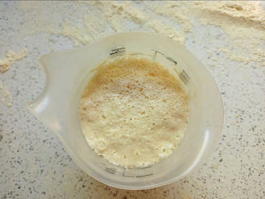 Далее просейте оставшуюся муку частями через ситечко или специальную кружку-сеялку в миску. Муку я взвешивала на кухонных весах - у меня ушло ровно столько, сколько написано в рецепте. Помните, что муки может понадобиться меньше или больше, подробнее об этом можно почитать в статье, ссылка на нее есть в конце рецепта. Замесите тесто и переложите его на стол.