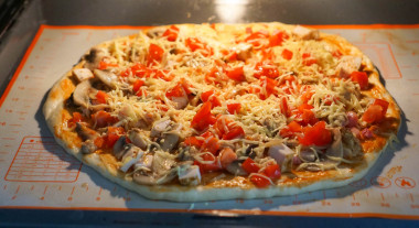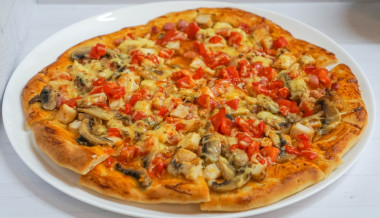 В выходной день решила приготовить домашнюю пиццу, с тестом сильно заморачиваться не хотелось, поэтому на сайте нашла простой рецепт теста на воде с сухими дрожжами. Подготовила ингредиенты по списку, в тех же граммовках, указанных в рецепте. Замешала опару на сухих дрожжах и оставила на 10 минут. Далее замесила тесто, выложила в миску и поставила в духовку подходить при температуре 40 градусов, накрыв пищевой пленкой. Тесто хорошо поднялось и увеличилось в объеме. Тесто обмяла еще раз и раскатала необходимое количество для пиццы. Выложила на раскатанное тесто необходимые ингредиенты (грибы, помидоры, курицу, соус и сыр) и поставила выпекаться в духовку. Тесто в пицце получилось очень вкусным! Спасибо автору за простой рецепт вкусного универсального теста без яиц и молока!