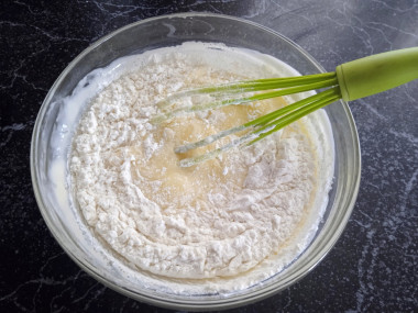 Добавить в просеянную муку немного соли для вкуса и тщательно перемешать все сухие продукты между собой.