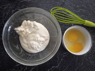 Отдельно разбить в емкость куриные яйца и слегка взбить их ручным венчиком до небольшой белой пены. А потом перелить яичную смесь в миску со сметаной и майонезом и хорошо перемешать все ингредиенты.