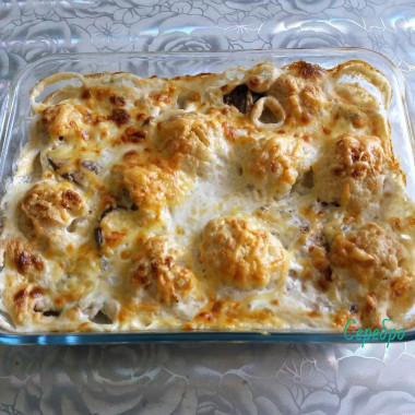Вокруг кусочков раскладываем отваренную цветную капусту.