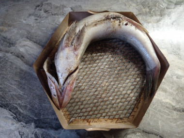 Судак был весом 1,8 кг. Я занималась чисткой и засолкой рыбы. Для этого я использовала 40 граммов соли и 20 граммов перца. Просолка длилась 4 часа. За копчение отвечал муж. Он использовал ольховую щепу.