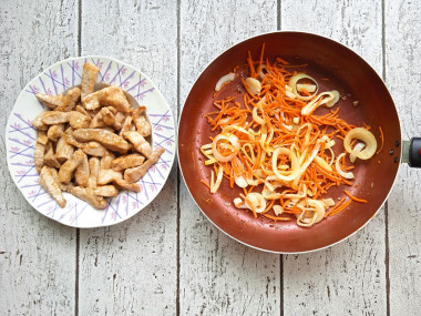 Снимите мясо со сковороды. В сковороду, на это же масло, выложите морковь и репчатый лук, обжаривайте их на среднем огне около 5-7 минут, чтобы морковь стала мягкой, а репчатый лук - прозрачным.