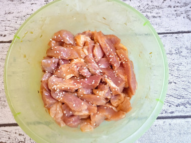 Выложите мясо в миску. Добавьте крахмал, столовую ложку соевого соуса, немного воды и горстку кунжута. Перемешайте и оставьте мясо для маринования минут на 15. Тем временем займемся другими ингредиентами.