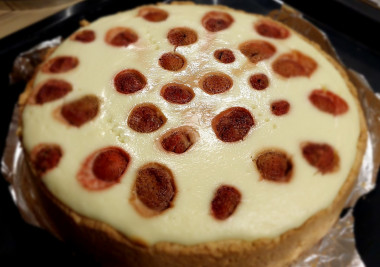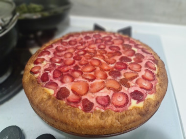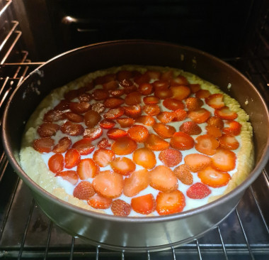 Сверху выложить клубнику порезанную пластинками, украшая поверхность пирога.