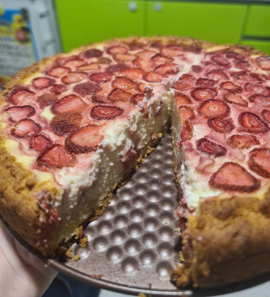 Спасибо за рецепт, пирог всем понравился, нежная творожная начинка, особенно в сочетании с клубникой, а у меня была в морозилке своя клубника. Аромат на всю квартиру был потрясающий! Действительно кусочек лета!