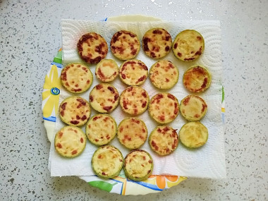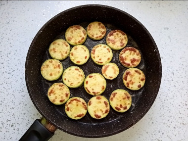 Разогрейте сковороду на среднем огне. Налейте растительного масла такое количество, чтобы дно было полностью скрыто тонким слоем. Аккуратно, чтобы не обжечься горячим маслом, выложите в сковороду кружочки кабачков. Обжарьте их с каждой стороны до лёгкого золотистого цвета. Между кружками кабачков оставляйте пространство, чтобы они обжаривались быстро и равномерно.
