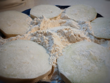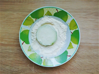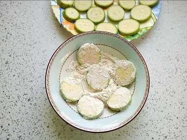 Обваляйте кружочки в муке, лишнюю стряхните, чтобы она не горела и не испортила вид готового блюда. Заготовки кабачков удобнее приготовить все сразу, укладывая стопочками.