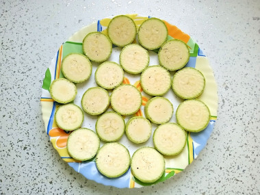 У меня был небольшой молодой кабачок, нарезала его на кружочки толщиной 5-7 мм. С обеих сторон присыпала солью и молотым душистым перцем. В следующий раз хочу добавить чесночный порошок или карри для большей остроты и аромата. Ведь кабачок сам по себе нейтральный по вкусу. Не бойтесь использовать различные специи!