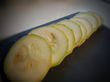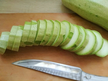 Кабачок помойте и обсушите. Так как кабачок совсем молодой, у него не надо срезать кожицу и удалять семена. Нарежьте его кружочками шириной 1 см.