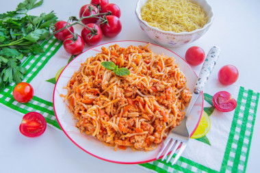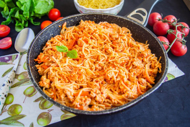 Перемешайте и тушите фарш под крышкой на небольшом огне около 10 минут. Если вода выкипит, добавьте еще. Густоту мясного соуса регулируйте по своему вкусу. Вода в сотейнике тем временем закипит. Посолите ее и закиньте вермишель. Варите ее по времени, указанном на упаковке, даже на минуту поменьше — тогда вермишель не разварится и не слипнется.