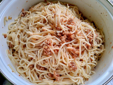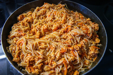 Готовую вермишель откиньте на дуршлаг. Добавьте ее в мясной соус, перемешайте. Накройте сковороду крышкой и подержите блюдо на маленьком огне пару минут, чтобы вермишель прогрелась, но не размякла.