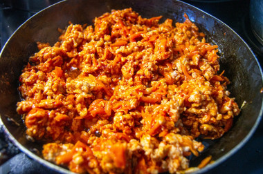 Натерла на терке морковь и обжарила на растительном масле до мягкости. Добавила фарш, обжарила до серого цвета. Отварила вермишель до полуготовности.