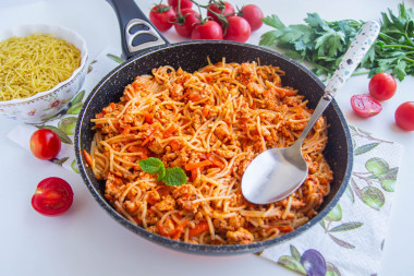 Захотелось приготовить что-то быстрое и не муторное на ужин. Нашла на сайте рецепт вермишели с фаршем, то, что нужно! Лука у меня не оказалось, но использовала морковь.