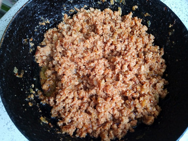Огонь убавьте. Жарьте фарш, разбивая комки, около 5 минут, до изменения цвета с розового на серый. Затем посолите и поперчите его, перемешайте. Добавьте в фарш томатную пасту. Вместо нее можно взять любой томатный соус или свежие измельченные помидоры без кожицы. Влейте около полустакана воды.