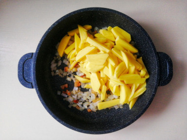 Лук я нарезала маленькими кубиками, переложила в сковородку, обжарила немного, а когда он стал прозрачным,  добавила нарезанную брусочками картошку.