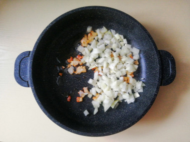 Добавьте нарезанный лук в сковороду к салу и обжарьте все вместе пару минут, до появления характерного аромата. Зажаривание сала и лука делайте на свой вкус. Сало можно зажарить еще сильнее.