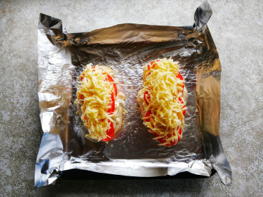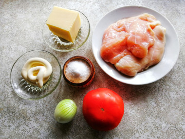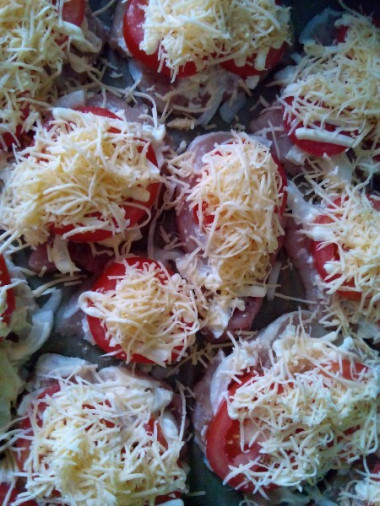 Мясо отбила с обеих сторон тупой стороной ножа, посолила, выложила на грудку лук, помидоры, добавила майонез, сверху закрыла всё натертым сыром.